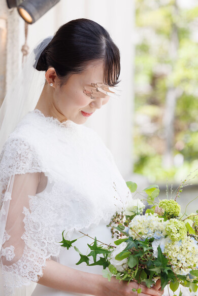 〜VERDEのドレスを選んだ理由〜 他のお店では見たことないデザインのドレスに心惹かれて試着の予約をしました。 一度めの試着からElleが気になっていたものの、途中かなりドレス迷子のなりVERDEさんにも他のお店にも何度も試着に伺いました。試着すればするほどElleが忘れられず…夫と妹の一押しもありElleを選びました。ほかのお店も見てゆっくり決めてくださいね、と決断を急がず待っていただいたのでが本当に ありがたかったです。 LifeStyleOrderさんとのセットプランをお願いし、夫の衣装は生地やボタンを 1つ1つ選んだ世界に一つだけのスーツを作っていただきました。新郎の衣装にもこだわりたいご夫婦にぜひぜひおすすめしたいです。 Elleは2wayのドレスなので1着でもしっかり雰囲気を変えることができ、挙式は花嫁らしいクラシカルな雰囲気、披露宴は少し可愛らしい雰囲気にしたかった私にぴったりのドレスでした。 ケープのレースや襟元と袖のキラキラ、腰のくるみボタンなど、細部にまで素敵なデザインがあるドレスなので、カメラマンさんにドレスのディテールも撮って欲しいとお願いをし、たくさん写真を残していただきました。 結婚式が終わって写真を見返して改めてElleを着ることができて幸せだったなと思っています。 〜挙式を終結ばれて思われたこと〜 コロナの影響で入籍から時間が経ったため、家族だけの小さな結婚式だったのですが、両親・祖父母をはじめ家族皆で思い出に残る楽しい時間を過ごすことができ、結婚式をしてよかったと心から思いました。 試着から何度も相談に乗ってくださった藤原さんと、ヘアメイクリハーサルでも迷子っぷりを発揮していた私に的確なアドバイスをくださった和智さんのおかげで、お気に入りのスタイルで当日を迎えることができました。 梅雨真っ只中の結婚式で当日も雨予報だったのですが、藤原さんに教えていただいた気象神社にお参りに行ったおかげで当日は雲一つないお天気で、幸せいっぱいの1日でした。 お二人のあたたかい雰囲気とサポートが心強く、VERDEさんにお願いしてよかったです。 本当にありがとうございました。 @NISHITETSU GRAND HOTEL / Fukuoka |